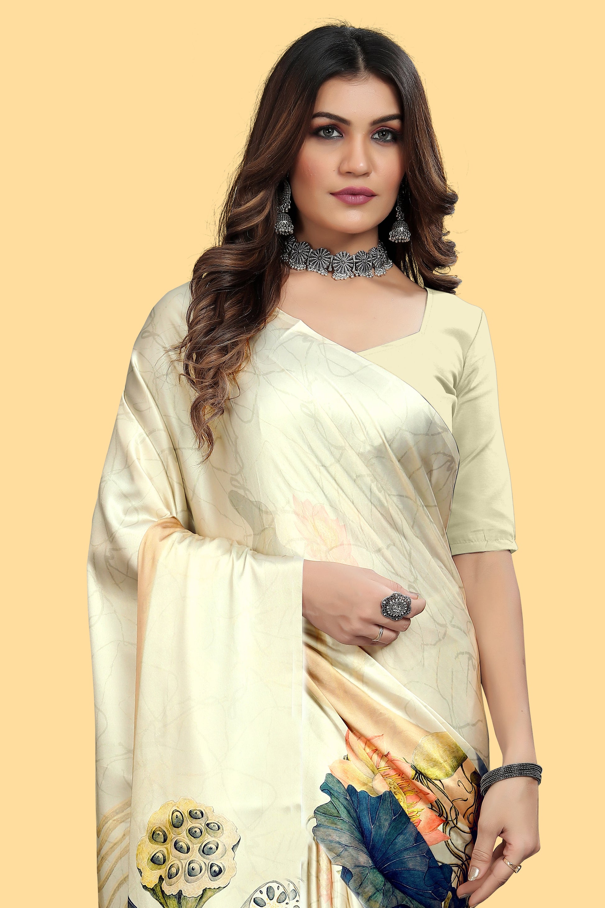Pretty White Digital Printed Satin Saree