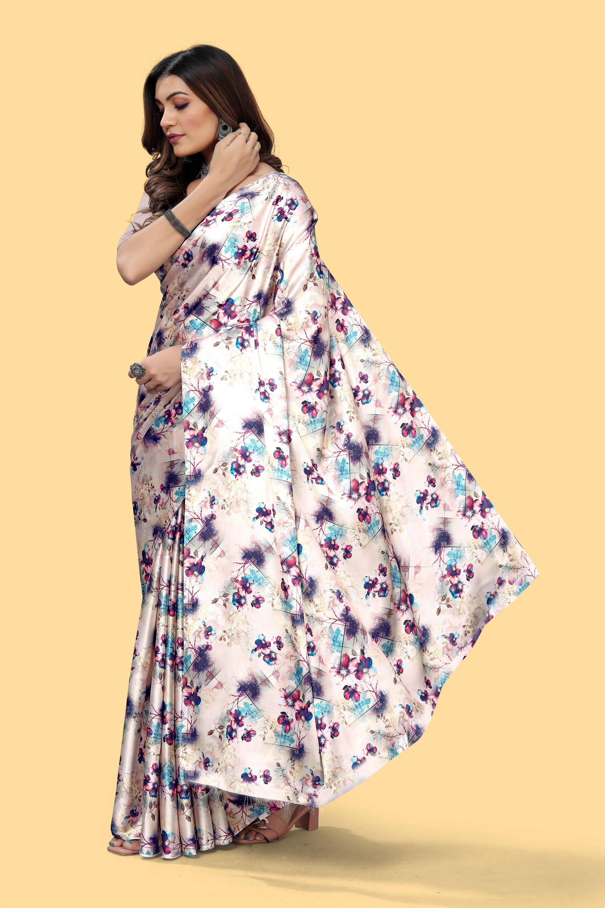 Purple Color Digital Printed Satin Saree