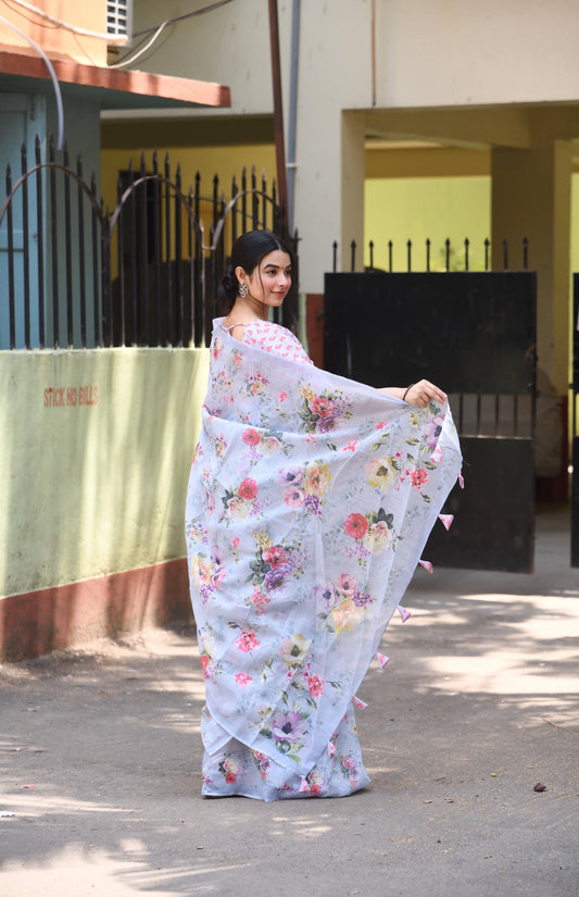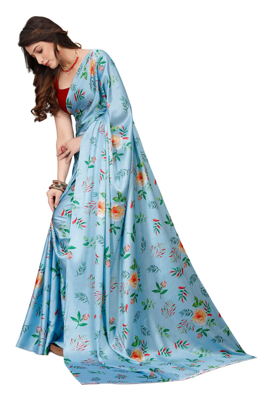 Blue Floral Printed Satin Saree