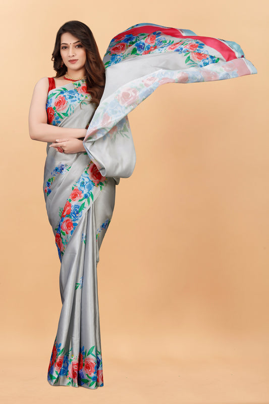 Party Wear Gray Color Printed Satin Silk Saree