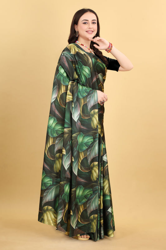 Digital Floral Black And Green Printed Satin Silk Saree