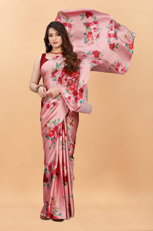 Fancy Pink Floral Printed Satin Silk Saree