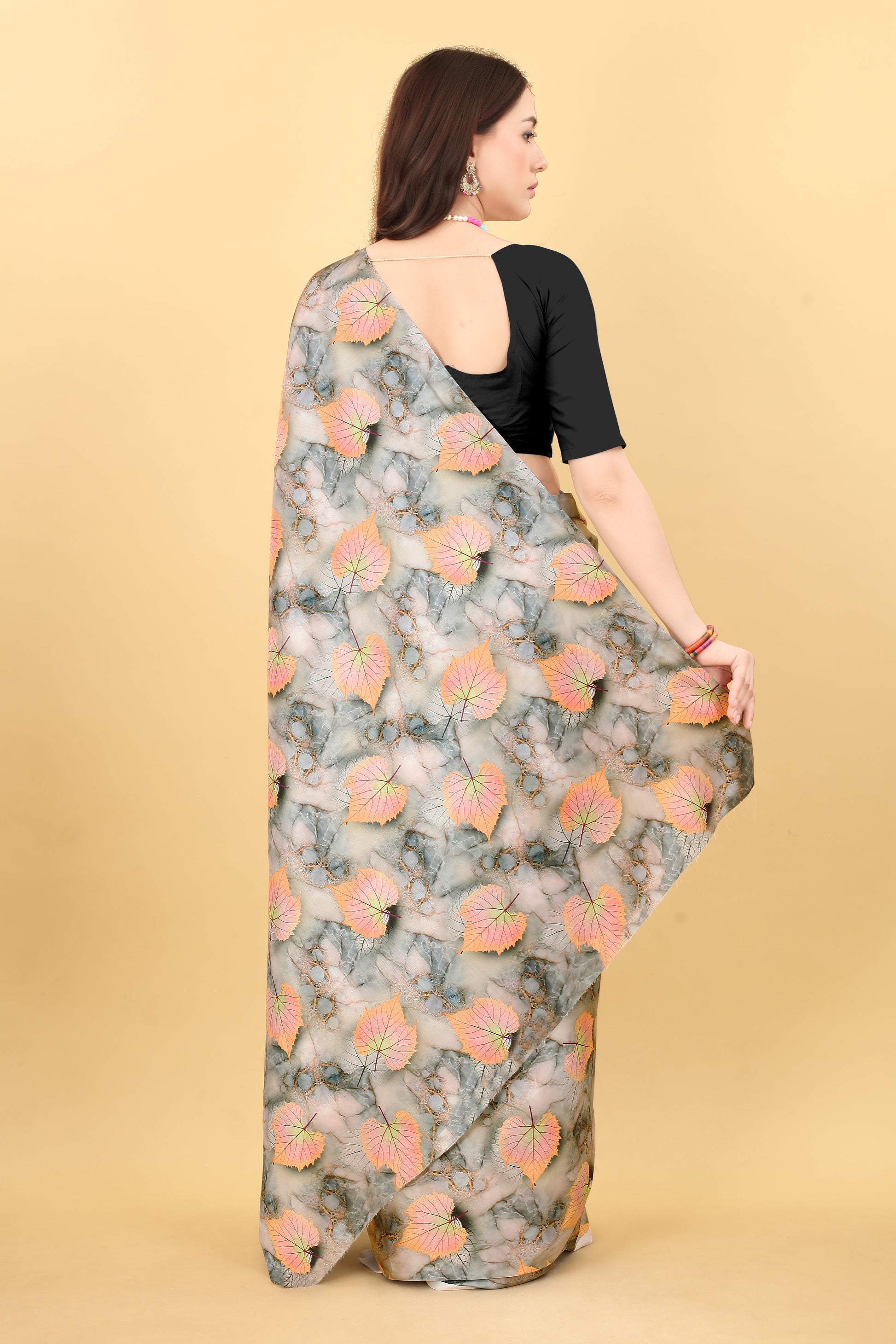 Majestic Grey Color Printed Satin Silk Saree
