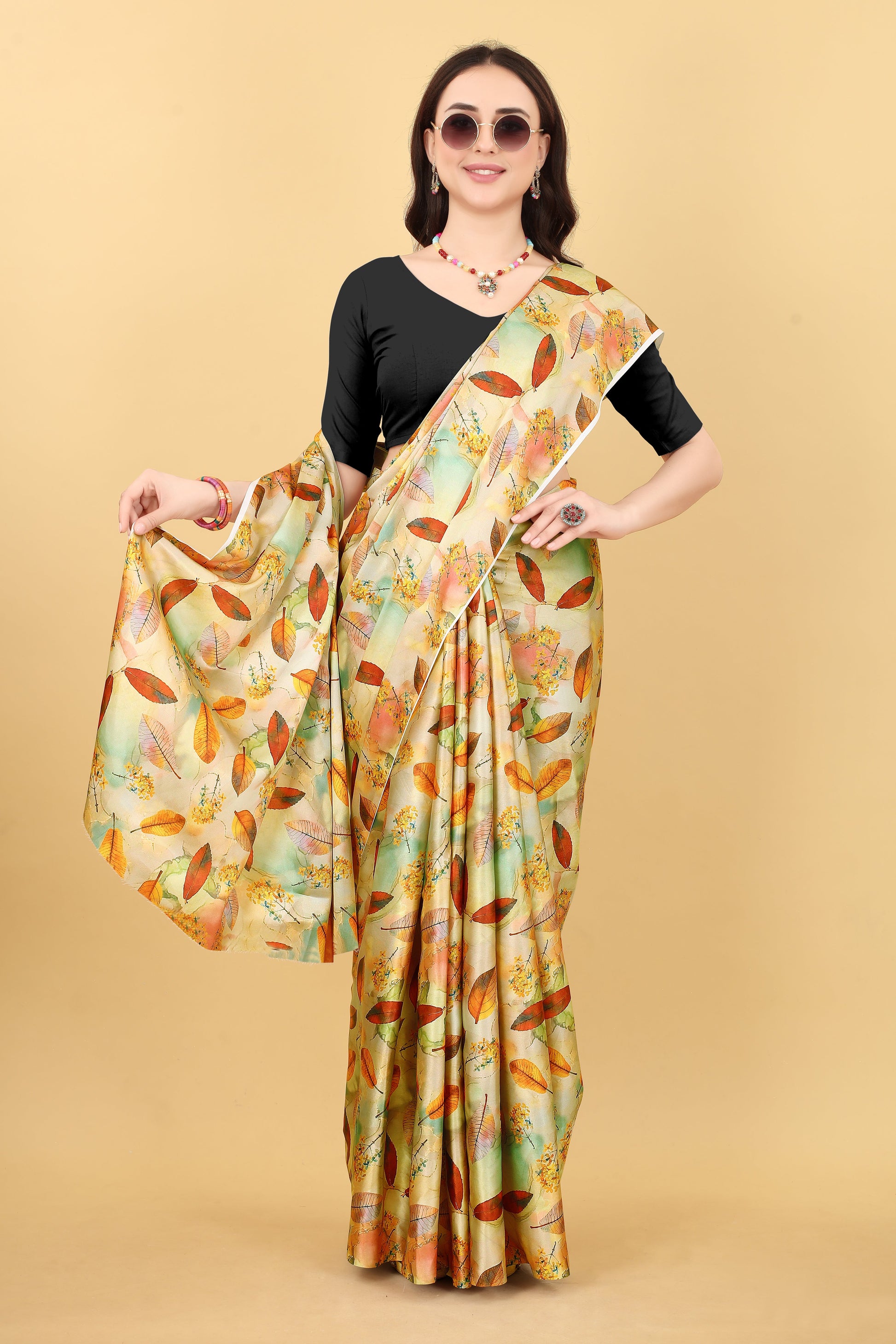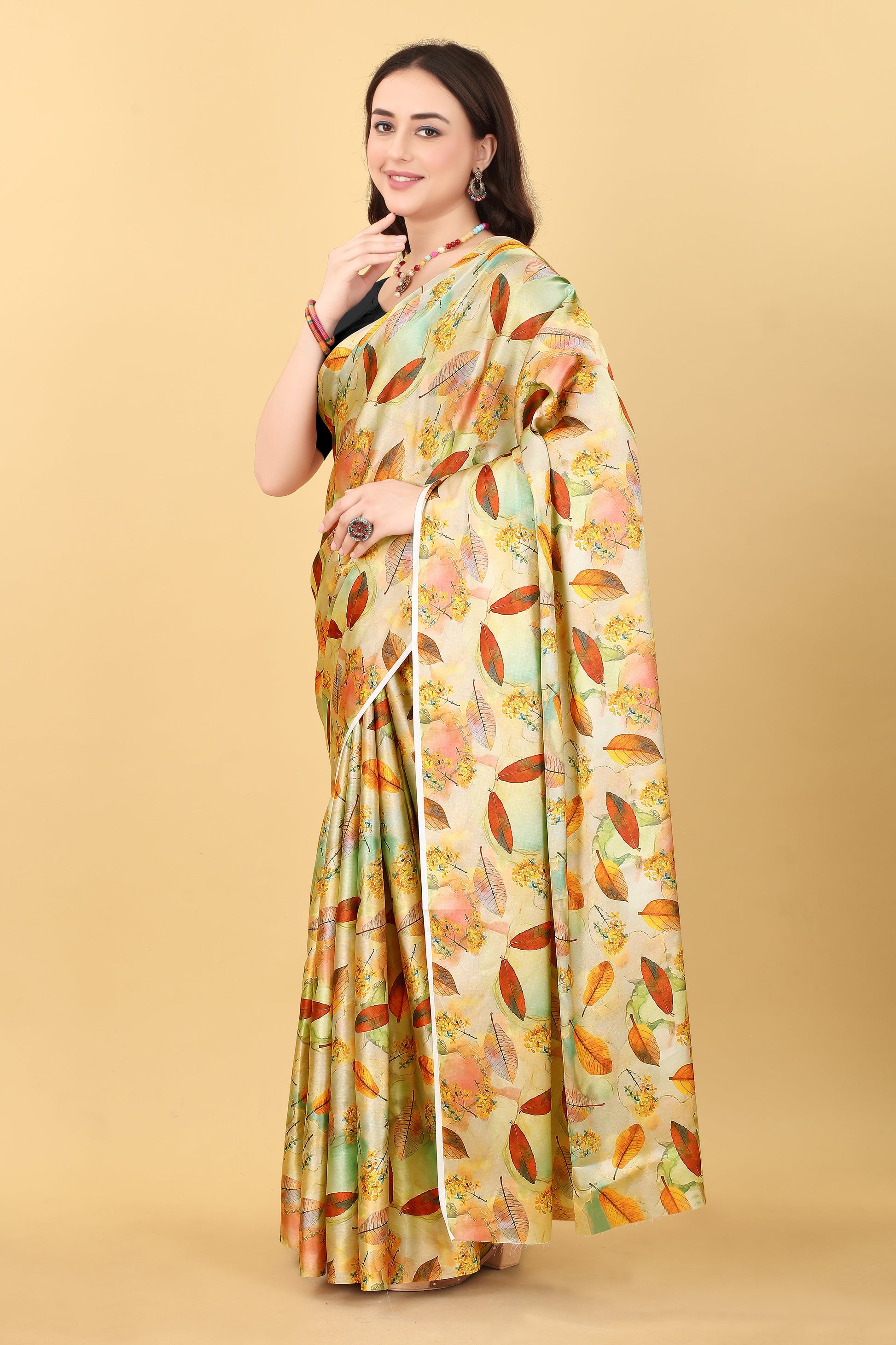 Yellow Flower Printed Satin Silk Saree